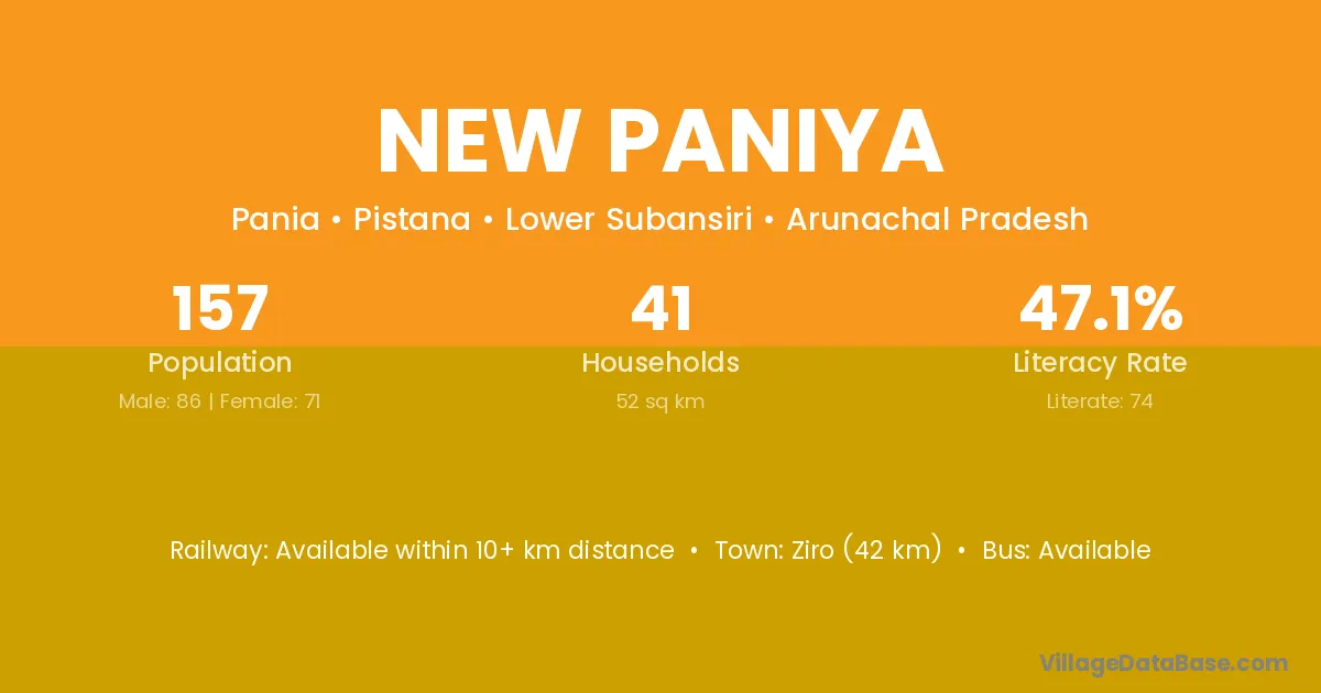 Ziro (42 km) is the nearest town to New Paniya village for major economic activities and is located approximately 42 km away.