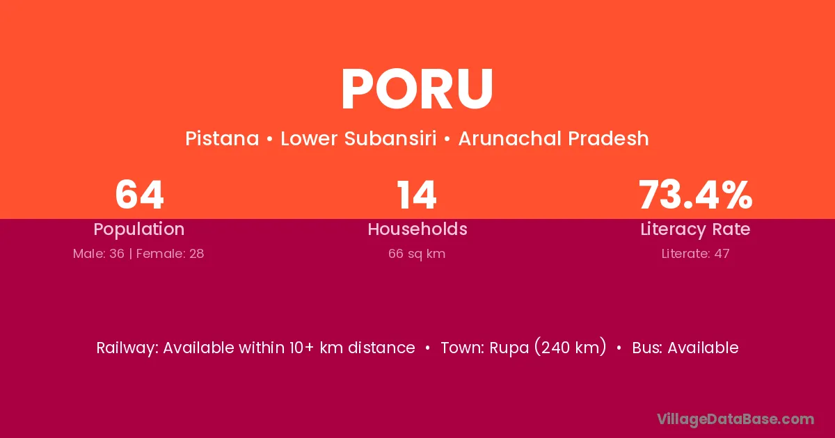 Rupa (240 km) is the nearest town to Poru village for major economic activities and is located approximately 240 km away.