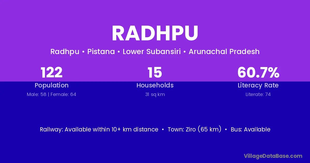 Ziro (65 km) is the nearest town to Radhpu village for major economic activities and is located approximately 65 km away.