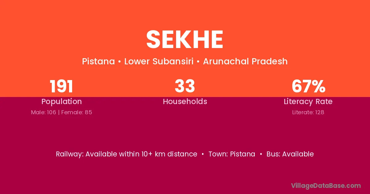 Sekhe village has a total population of 191 people, of which 106 are males and 85 are females.