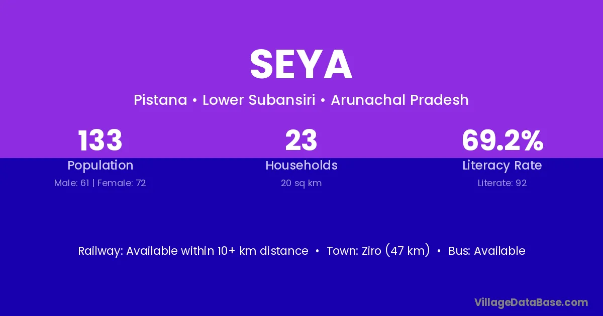 Ziro (47 km) is the nearest town to Seya village for major economic activities and is located approximately 47 km away.