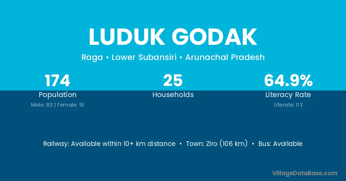Ziro (106 km) is the nearest town to Luduk Godak village for major economic activities and is located approximately 106 km away.