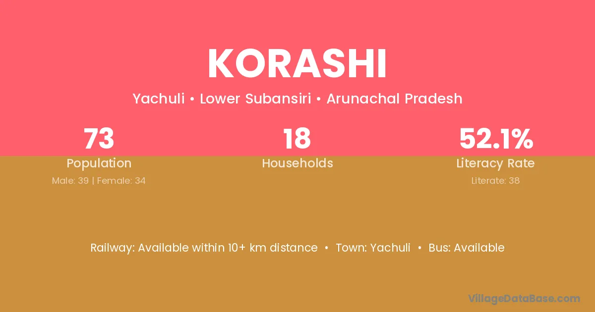 Korashi village has a total population of 73 people, of which 39 are males and 34 are females.