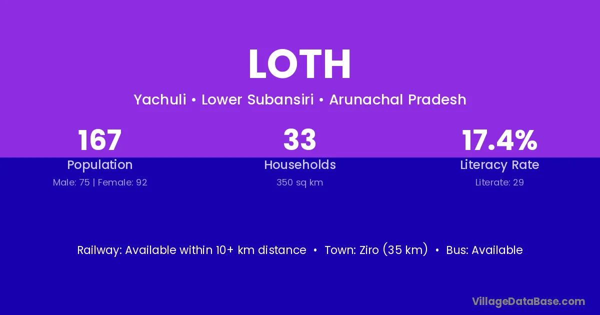 Ziro (35 km) is the nearest town to Loth village for major economic activities and is located approximately 35 km away.