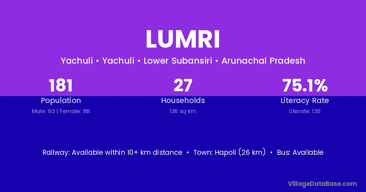 Hapoli (26 km) is the nearest town to Lumri village for major economic activities and is located approximately 26 km away.