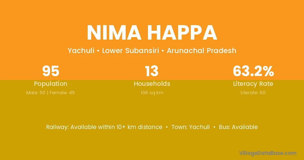 Nima Happa village has a total population of 95 people, of which 50 are males and 45 are females.