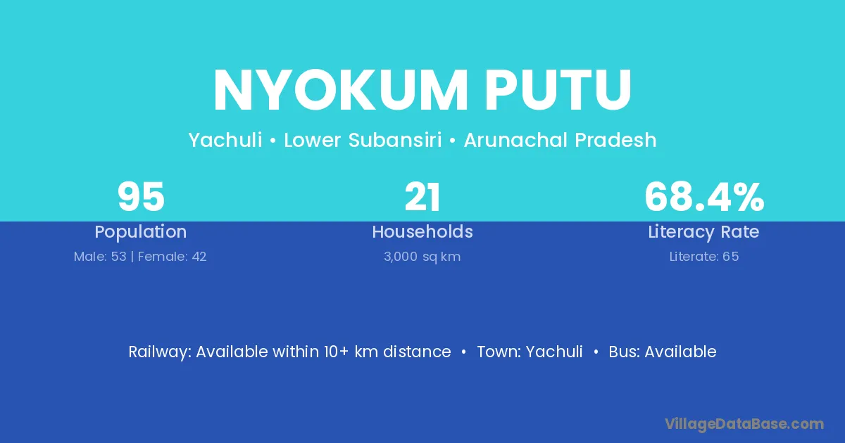 Nyokum Putu village has a total population of 95 people, of which 53 are males and 42 are females.