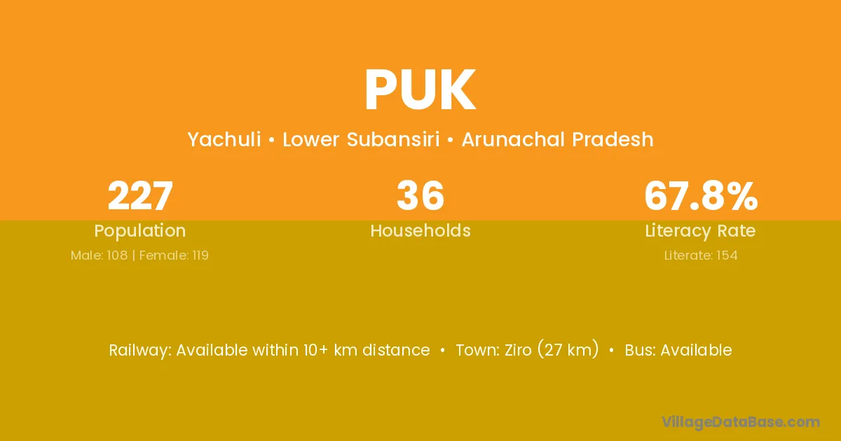 Ziro (27 km) is the nearest town to Puk village for major economic activities and is located approximately 27 km away.