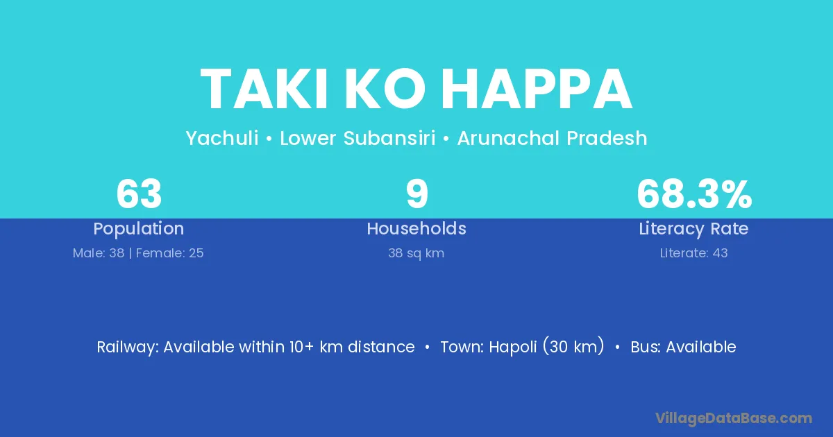 Taki Ko Happa village has a total population of 63 people, of which 38 are males and 25 are females.