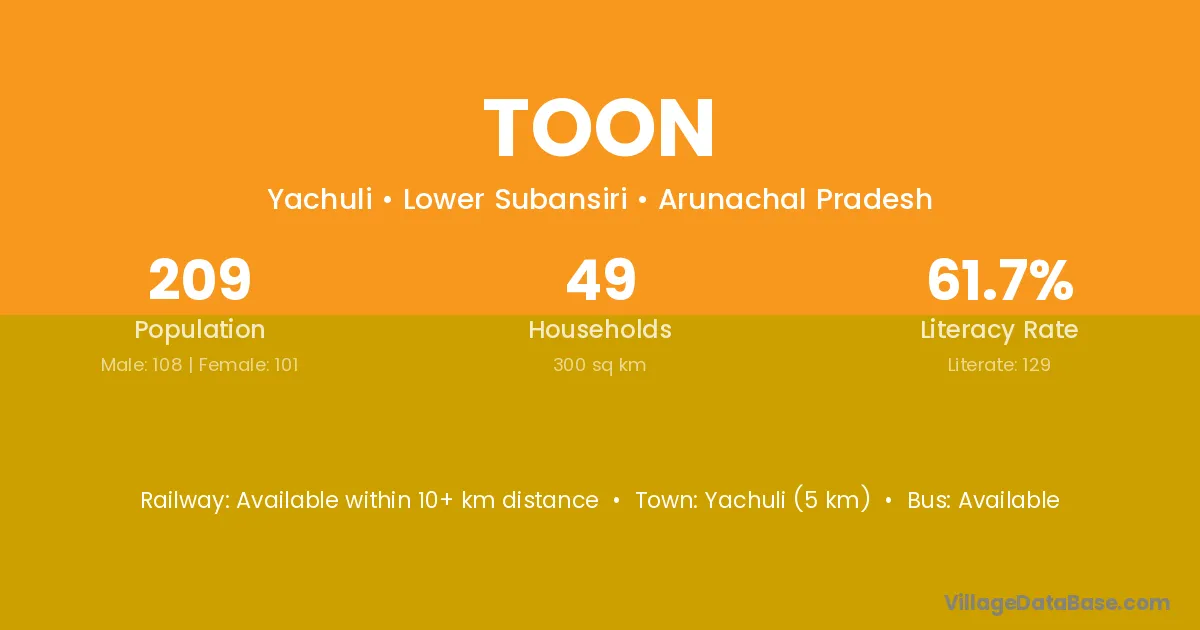 Yachuli (5 km) is the nearest town to Toon village for major economic activities and is located approximately 5 km away.