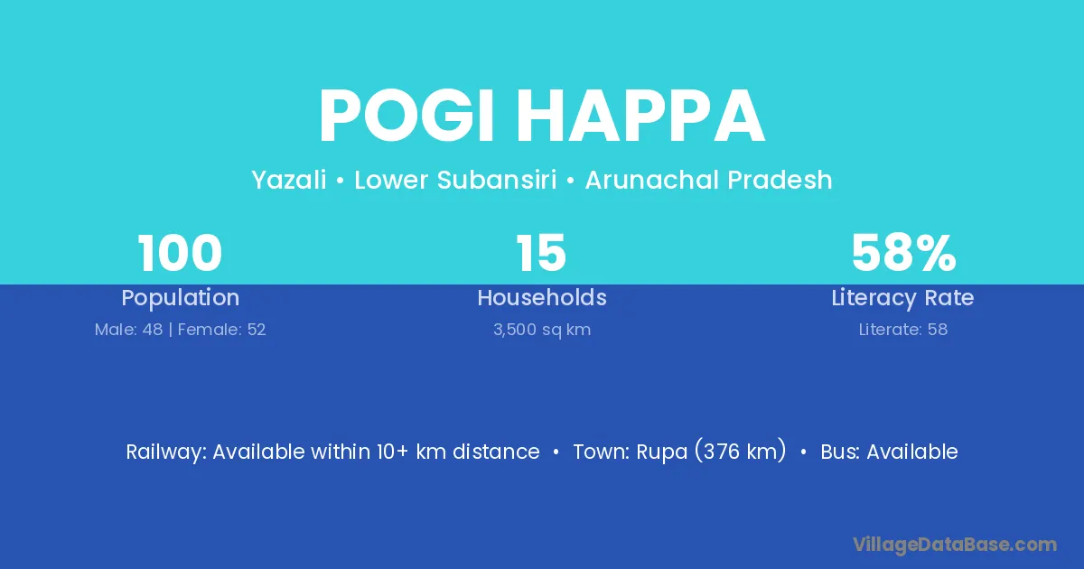 Rupa (376 km) is the nearest town to Pogi Happa village for major economic activities and is located approximately 376 km away.
