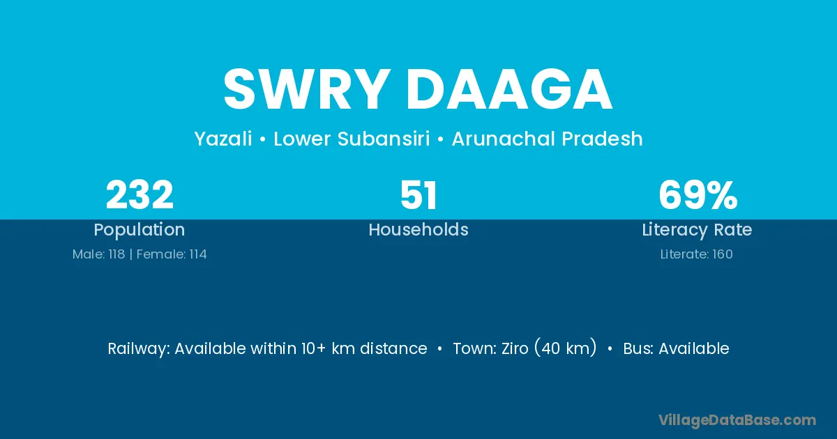 Ziro (40 km) is the nearest town to Swry Daaga village for major economic activities and is located approximately 40 km away.
