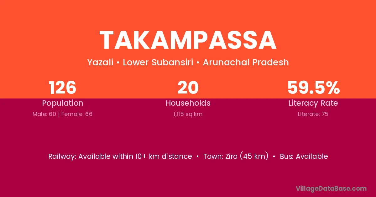 Ziro (45 km) is the nearest town to Takampassa village for major economic activities and is located approximately 45 km away.