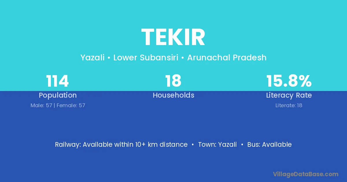 The literacy rate of Tekir village is 15.79%. Male literacy stands at 15.79% and female literacy at 15.79%.