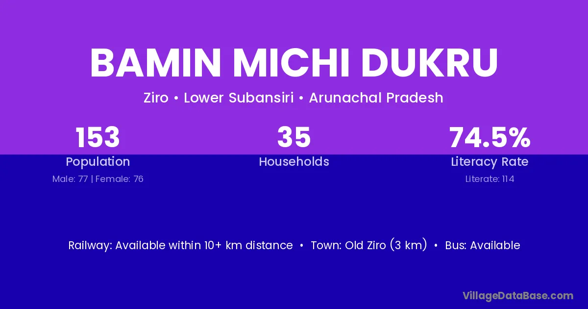 Old Ziro (3 km) is the nearest town to Bamin Michi Dukru village for major economic activities and is located approximately 3 km away.