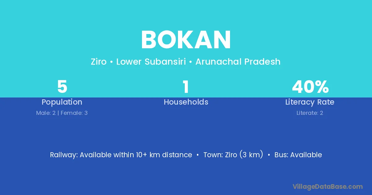 Bokan village has a total population of 5 people, of which 2 are males and 3 are females.