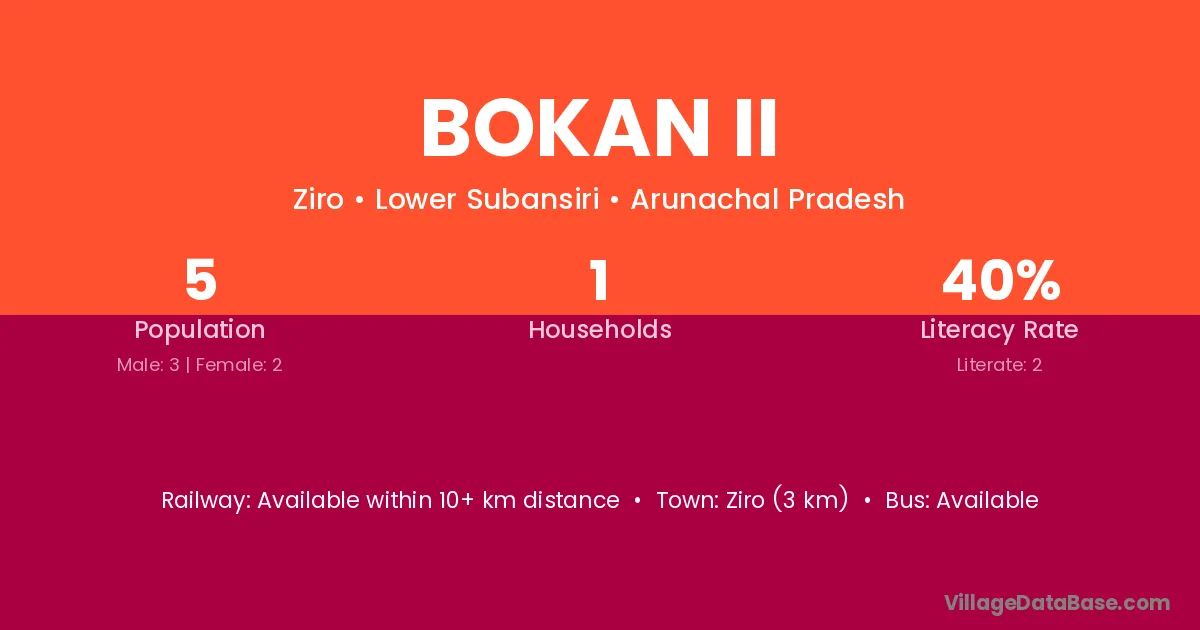 Bokan Ii village has a total population of 5 people, of which 3 are males and 2 are females.