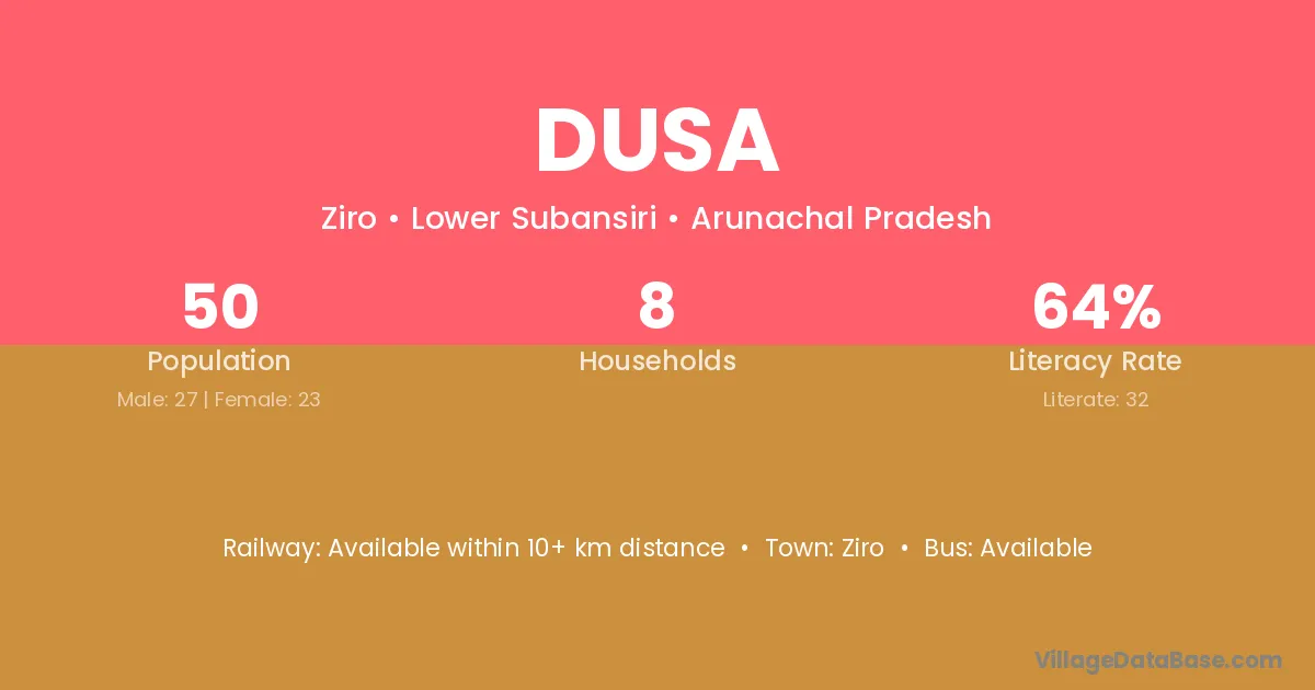 Dusa village has a total population of 50 people, of which 27 are males and 23 are females.