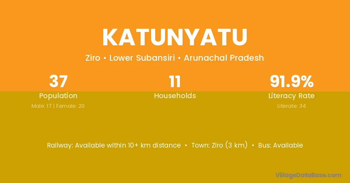 Ziro (3 km) is the nearest town to Katunyatu village for major economic activities and is located approximately 3 km away.