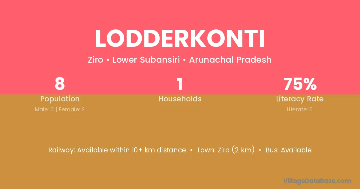 Ziro (2 km) is the nearest town to Lodderkonti village for major economic activities and is located approximately 2 km away.