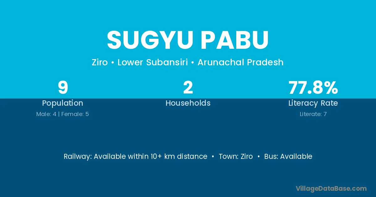 Sugyu Pabu village has a total population of 9 people, of which 4 are males and 5 are females.