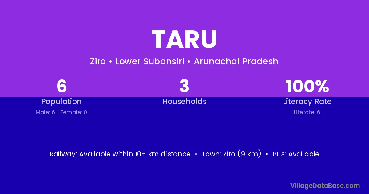 Ziro (9 km) is the nearest town to Taru village for major economic activities and is located approximately 9 km away.