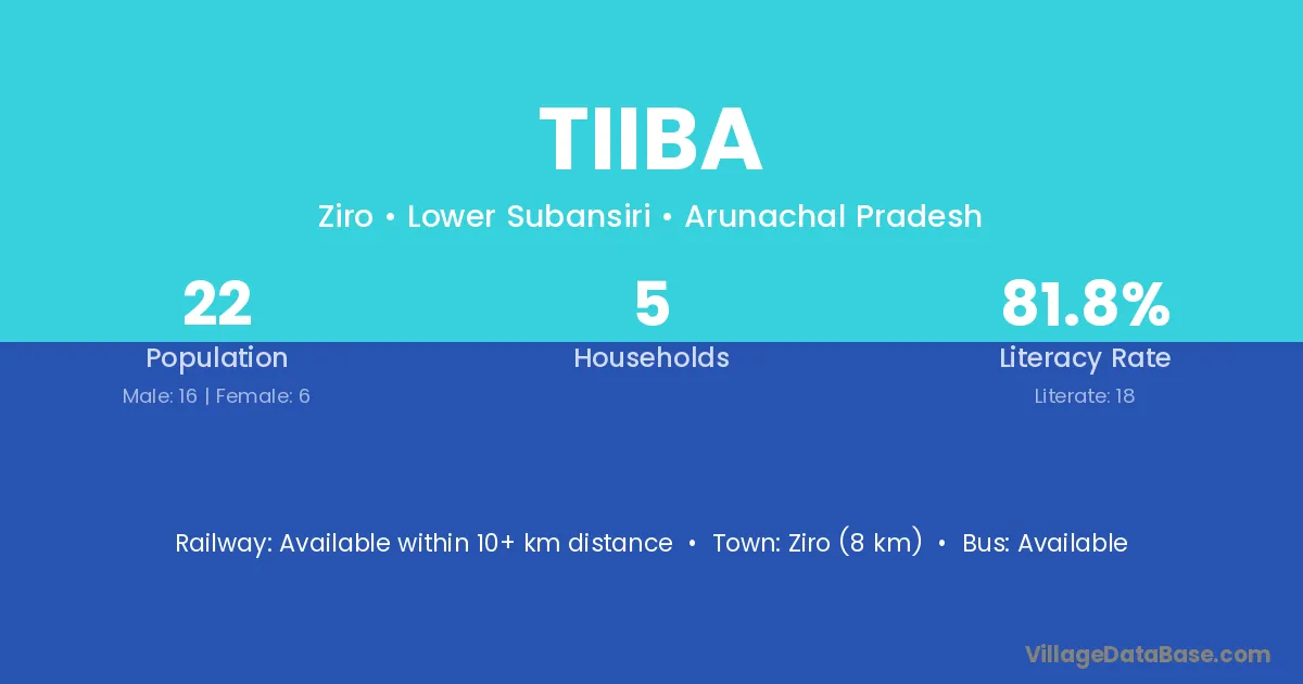 Ziro (8 km) is the nearest town to Tiiba village for major economic activities and is located approximately 8 km away.