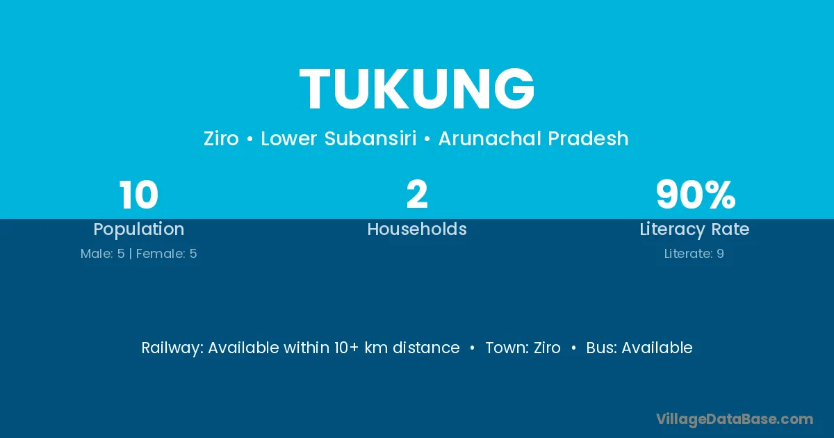 The literacy rate of Tukung village is 90.00%. Male literacy stands at 80.00% and female literacy at 100.00%.