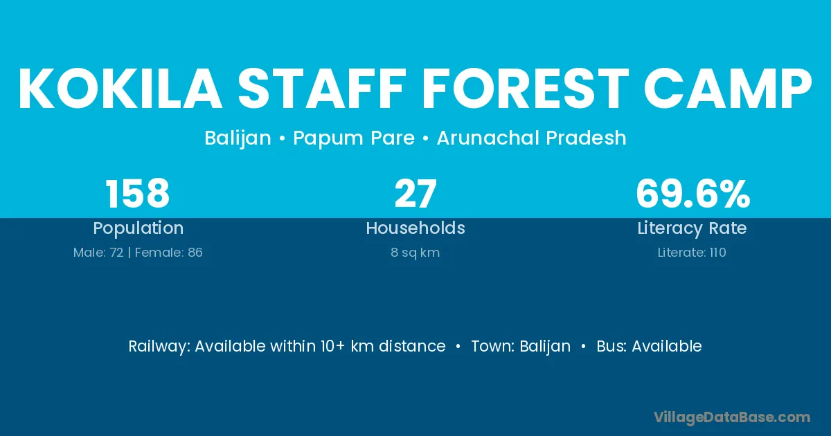 Kokila Staff Forest Camp village has a total population of 158 people, of which 72 are males and 86 are females.