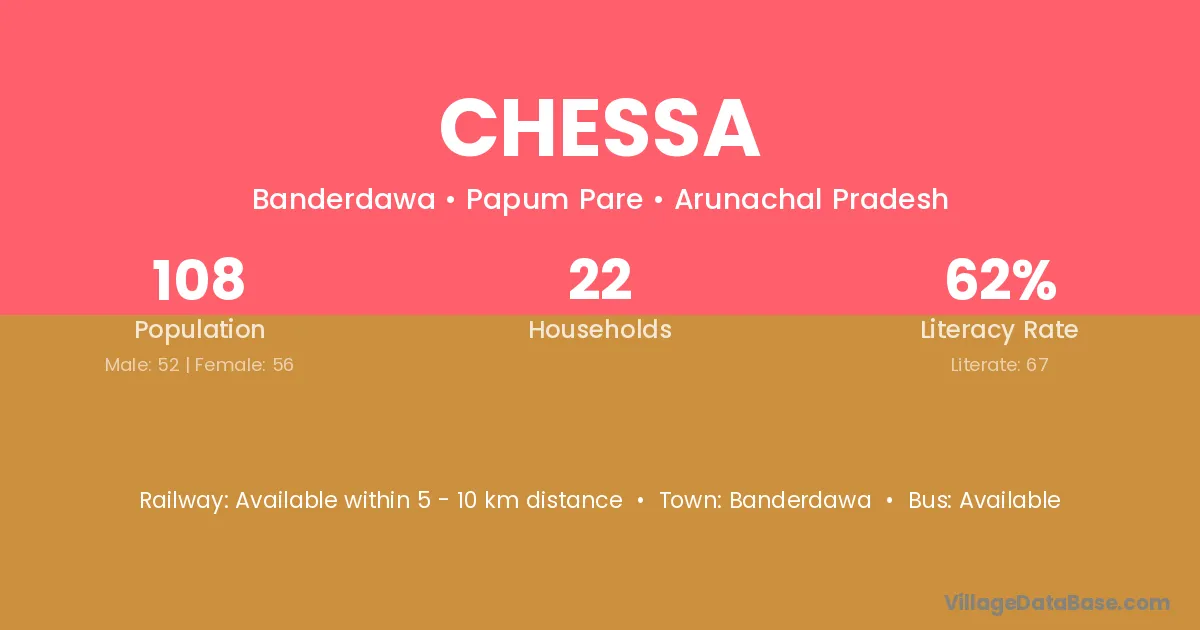 Chessa village has a total population of 108 people, of which 52 are males and 56 are females.