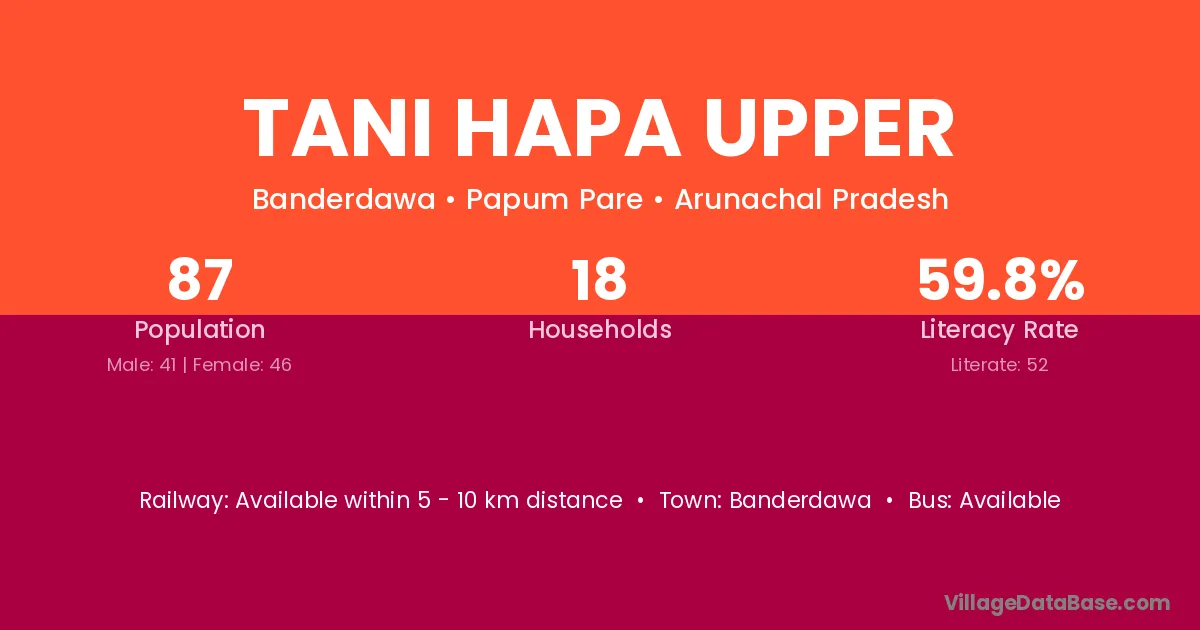 Tani Hapa Upper village has a total population of 87 people, of which 41 are males and 46 are females.