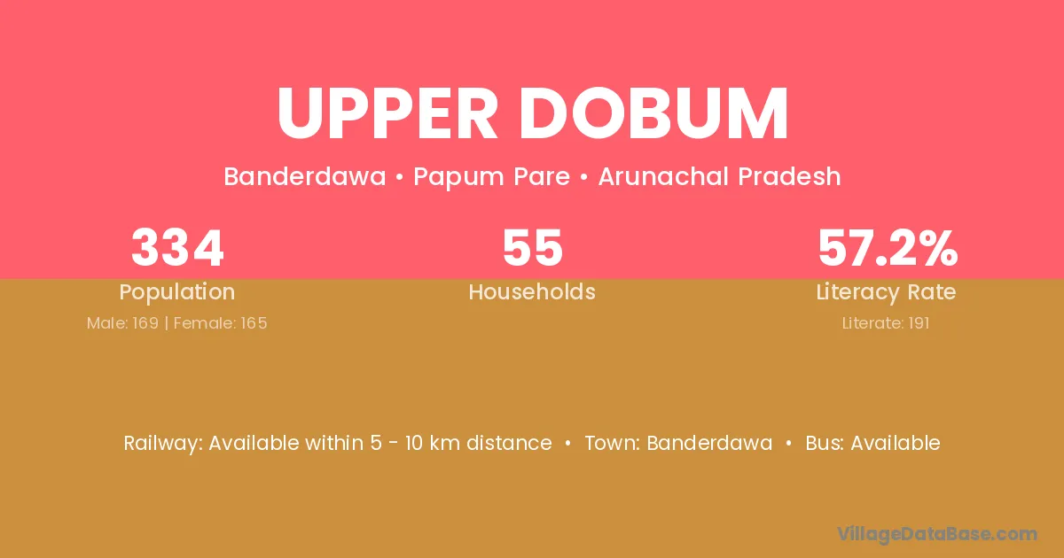 The literacy rate of Upper Dobum village is 57.19%. Male literacy stands at 57.99% and female literacy at 56.36%.