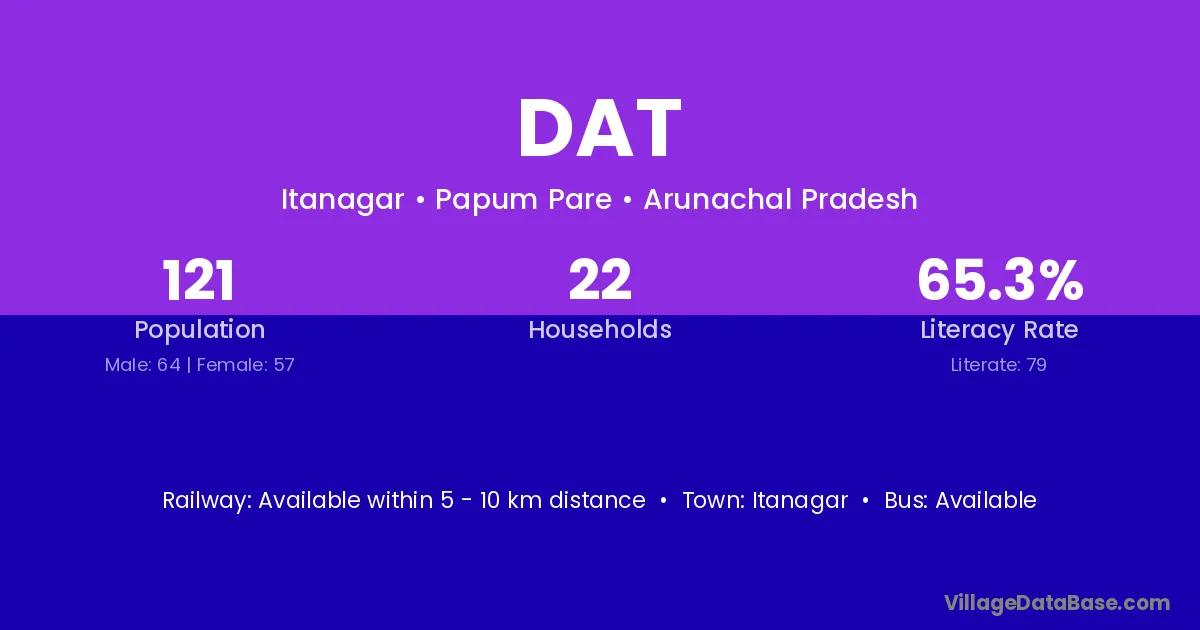 Dat village has a total population of 121 people, of which 64 are males and 57 are females.