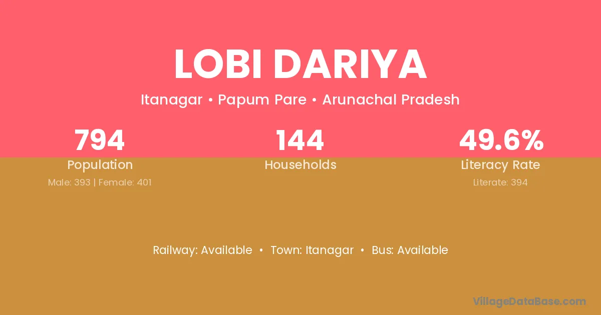 Itanagar is the nearest town to Lobi Dariya village for major economic activities