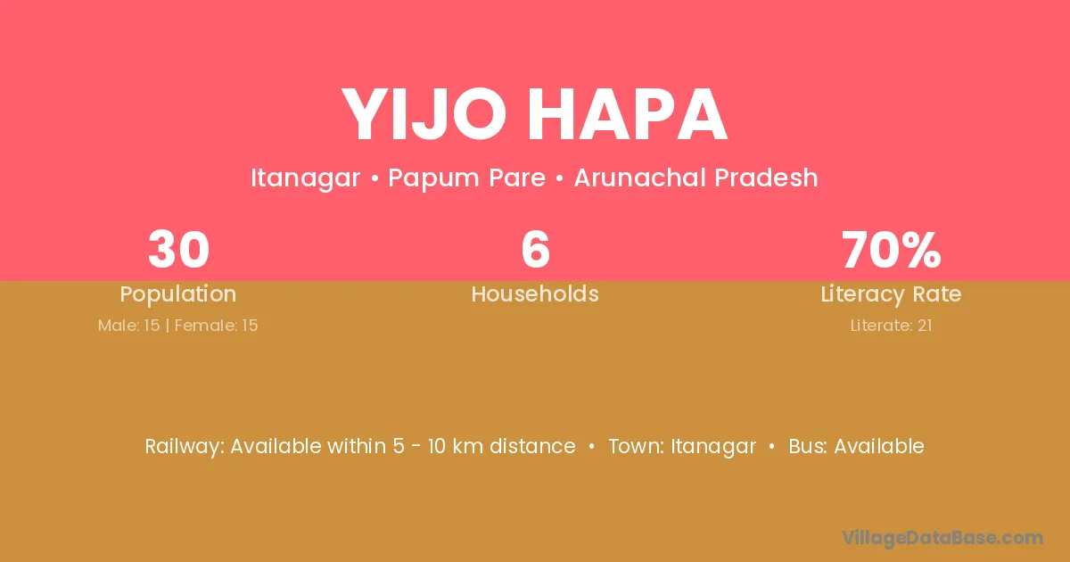 Yijo Hapa village has a total population of 30 people, of which 15 are males and 15 are females.