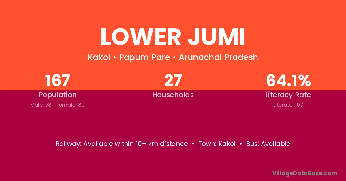 Lower Jumi village has a total population of 167 people, of which 78 are males and 89 are females.