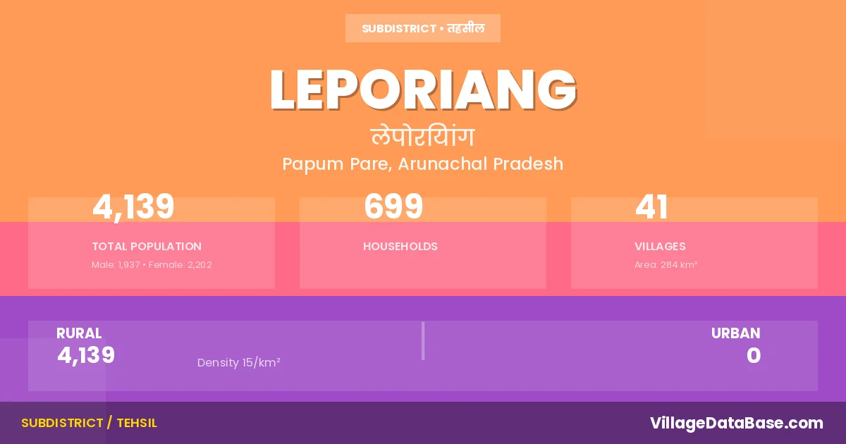 According to the 2011 census The total area of Leporiang Circle is 284 km², with a population of 4139 people. The population density is 15 inhabitants per square kilometre, and there are approximately 699 houses in the sub district.