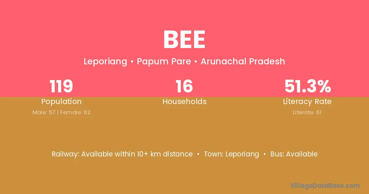 The literacy rate of Bee village is 51.26%. Male literacy stands at 59.65% and female literacy at 43.55%.
