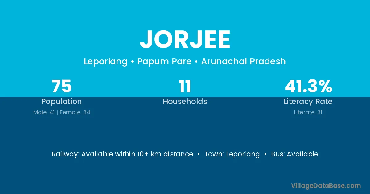 The literacy rate of Jorjee village is 41.33%. Male literacy stands at 46.34% and female literacy at 35.29%.