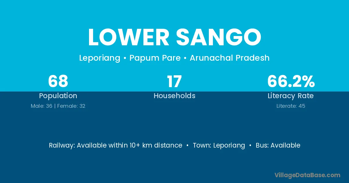 The literacy rate of Lower Sango village is 66.18%. Male literacy stands at 72.22% and female literacy at 59.38%.
