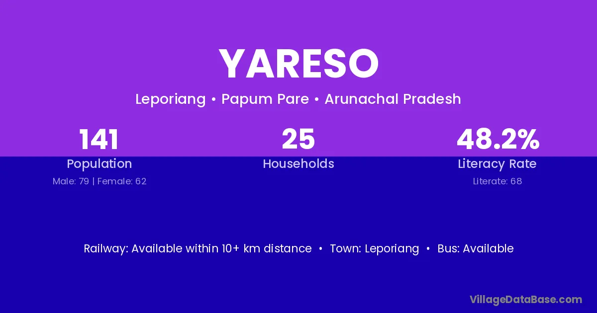 The literacy rate of Yareso village is 48.23%. Male literacy stands at 55.70% and female literacy at 38.71%.