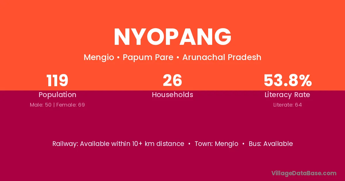 Nyopang village has a total population of 119 people, of which 50 are males and 69 are females.