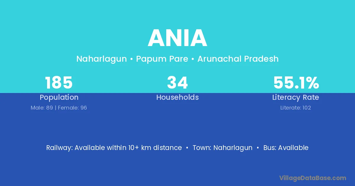 Ania village has a total population of 185 people, of which 89 are males and 96 are females.