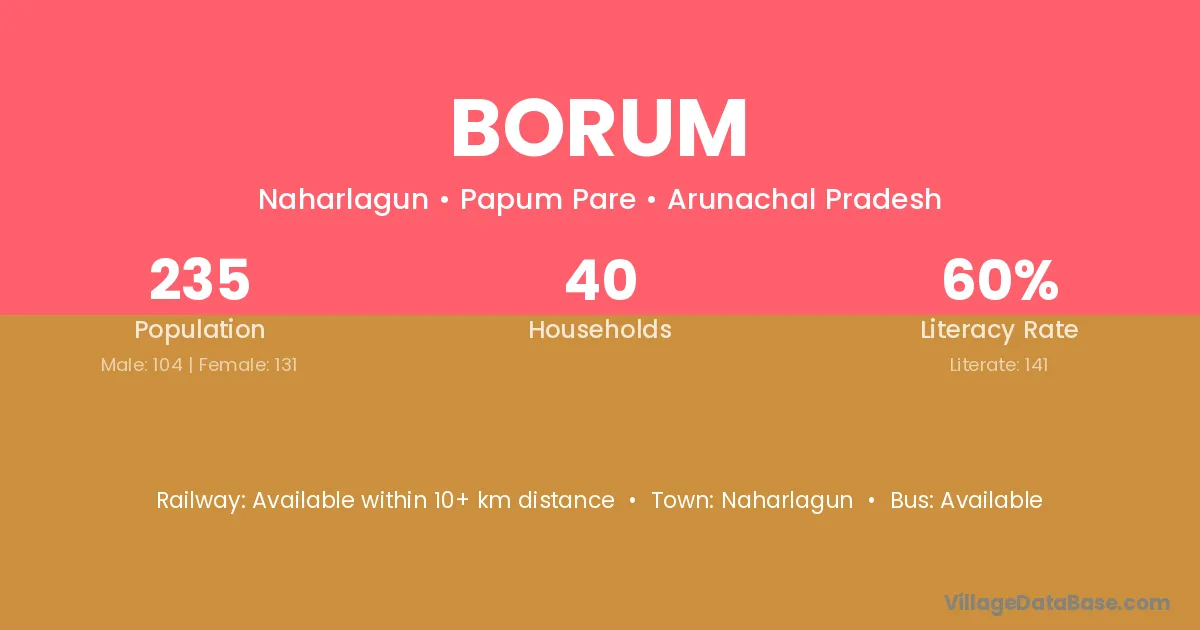 Borum village has a total population of 235 people, of which 104 are males and 131 are females.