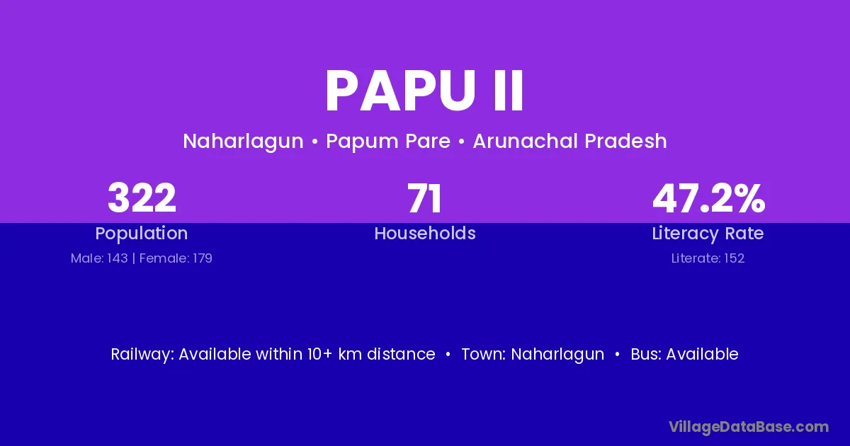 The literacy rate of Papu Ii village is 47.20%. Male literacy stands at 48.95% and female literacy at 45.81%.