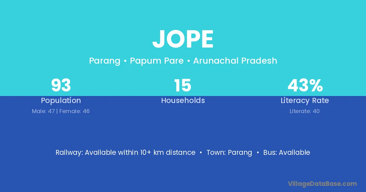 The literacy rate of Jope village is 43.01%. Male literacy stands at 55.32% and female literacy at 30.43%.