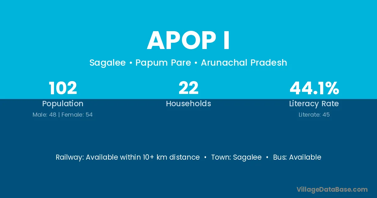 The literacy rate of Apop I village is 44.12%. Male literacy stands at 54.17% and female literacy at 35.19%.