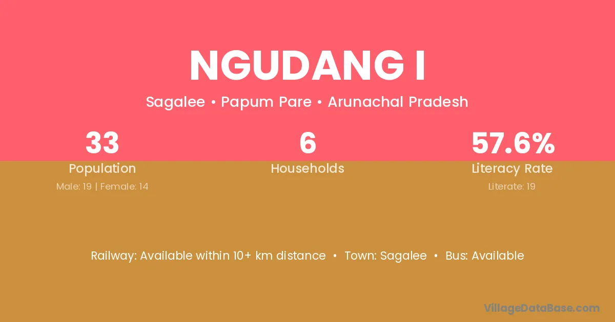 The literacy rate of Ngudang I village is 57.58%. Male literacy stands at 73.68% and female literacy at 35.71%.