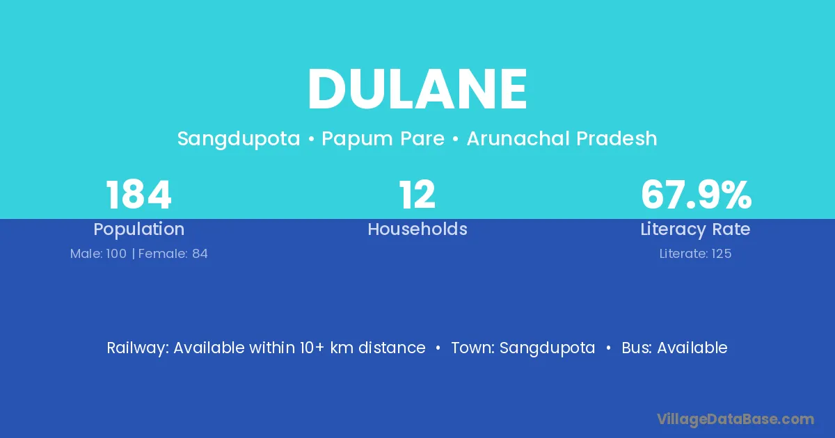 Dulane village has a total population of 184 people, of which 100 are males and 84 are females.