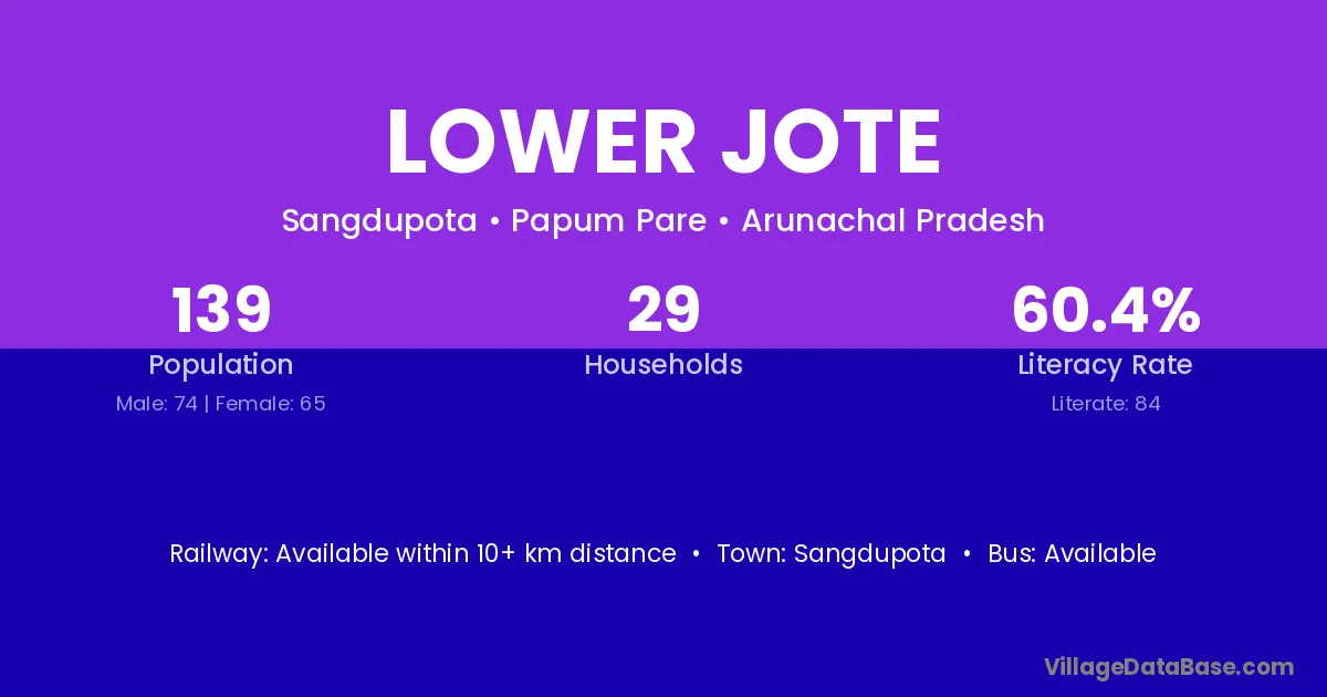 Lower Jote village has a total population of 139 people, of which 74 are males and 65 are females.